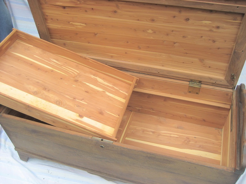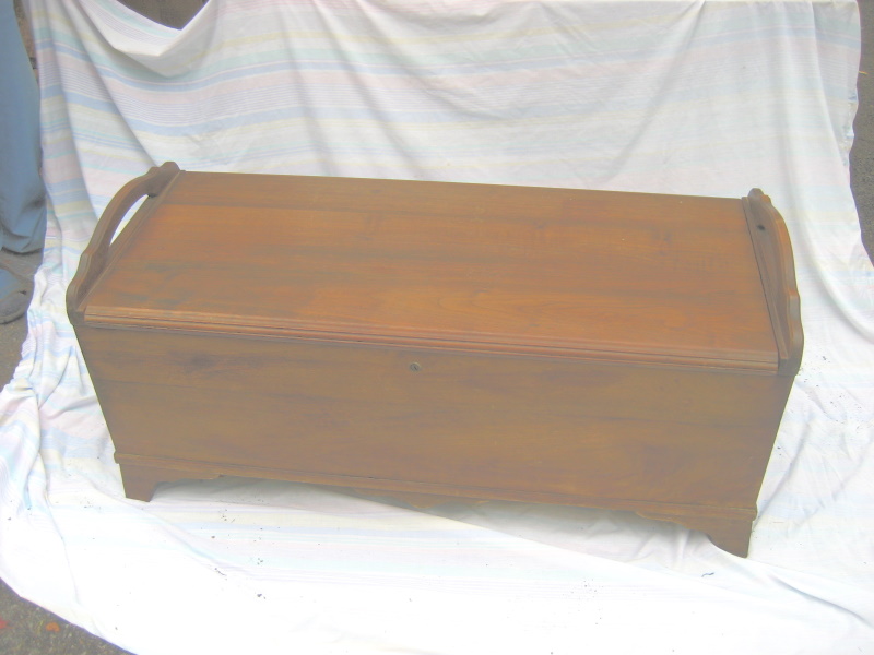 46"x19"x19" outside dimensions excluding handles. Removable/sliding tray inside. Mechanically solid except about 2" of one back leg is missing. Easily fixed or just use a 2x4 block. The top has light scratches but could easily be refinished. Makes a perfect combination seat and storage chest for blankets, sweaters, etc.