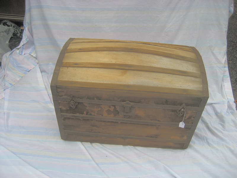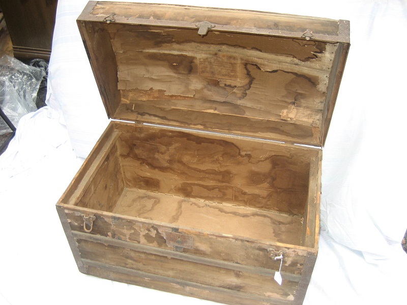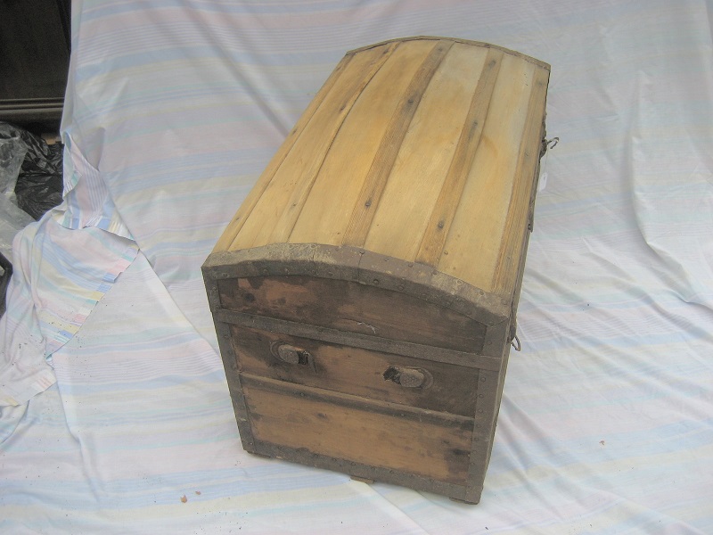 17"x30"x20" dome top trunk. Very solid. Surprisingly lightweight. Obviously built to last and withstand rough handling. Hinge good. One latch is good although very rusty, one has a broken loop but it does move. Locking latch is intact but I have not dared to actually snap it shut. Metal banding around edges has some rust but is solid. It looks OK unrestored but I think with some work it could look very good. Can't find any markings to indicate age or maker. I will consider reasonable offers. These things are going for $750~$1500 on Etsy.